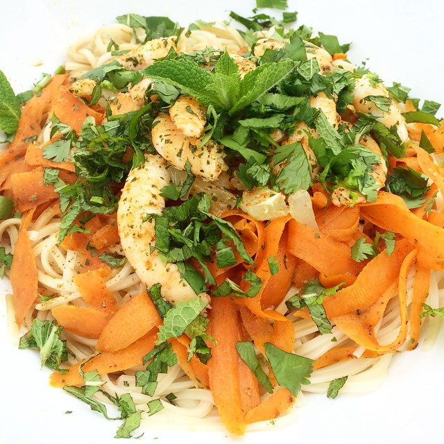 Dispose on the top the carrot stripes, the shrimps with lemon, pour a bit of soy sauce, then add the mint and coriander. Add some salt and pepper and that’s it.